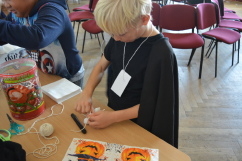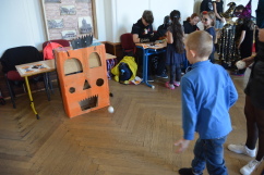 Hrál se halloweenpong, skořápky (ne o peníze ;-)), prolézalo se pavoučí sítí, poznávaly se poslepu různé věci, házelo se na terč, skládalo se a luštilo, došlo i na tajnou ochutnávku. Za každé splněné stanoviště žáci obdrželi písmenko do své hrací karty. Na konci cesty bylo potřeba sestavit z písmenek slovo dne. Zkrátka nabitá vyučovací hodina. :-) Některé třídy si stihly zahrát i židličkovanou, což byla, dle reakcí soutěžících, největší zábava. A protože se všichni velmi snažili, nechyběla sladká odměna. Velmi děkujeme všem žákům, kteří se podíleli na organizaci Halloweenu, rodičům žáků, třídním učitelům a třídám 1. stupně, že s námi strávili společné dopoledne v aule školy. Doufáme, že jste (jsme) si to všichni užili.