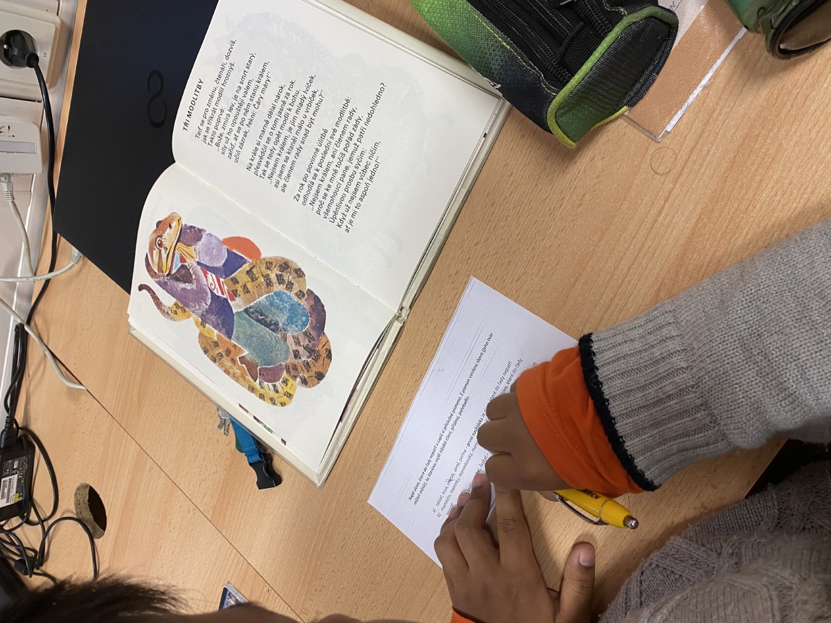 Bajku, malý literární útvar, pojali šesťáci nejprve badatelsky. Zjišťovali informace, porovnávali a hodnotili texty a ilustrace. Procvičili si správné řazení textu, vyhledávali odbornou terminologii. Od ponaučení v bajkách se dostali k příslovím, která skládali v Triminu a přiřazovali k životním situacím. Listovali knihami, slovníky, pracovali s iPadem i notebookem. Mohli pracovat ve skupinách i jednotlivě, každý si zvolil svou cestu. Nakonec si napsali vlastní text bajky na téma „Bez práce nejsou koláče“.