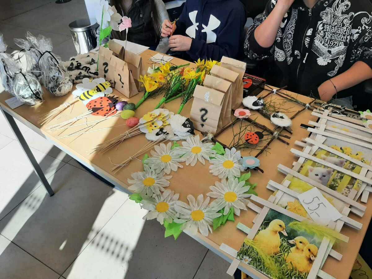 Letos se nám na velikonoční jarmark sešlo tolik výrobků, že jsme se museli částečně přemístit do venkovního prostoru k zadnímu vchodu pobočky.