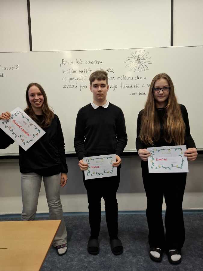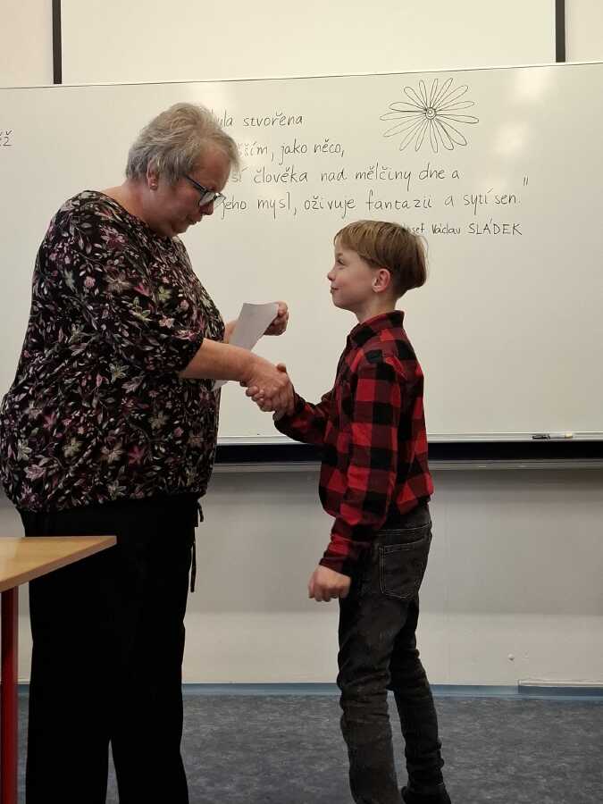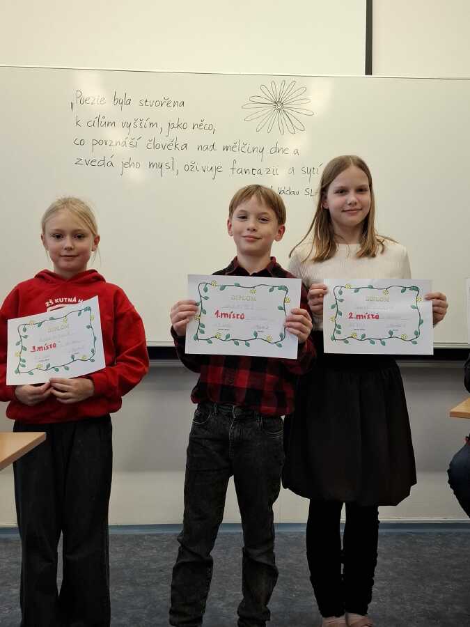 Čestné uznání obdržela Amálka Růžičková za náročný text. První 2 soutěžící ve všech kategoriích postupují do okresního kola v Tylově divadle. Děkujeme všem recitátorům a postupujícím držíme pěsti v okresním kole.
