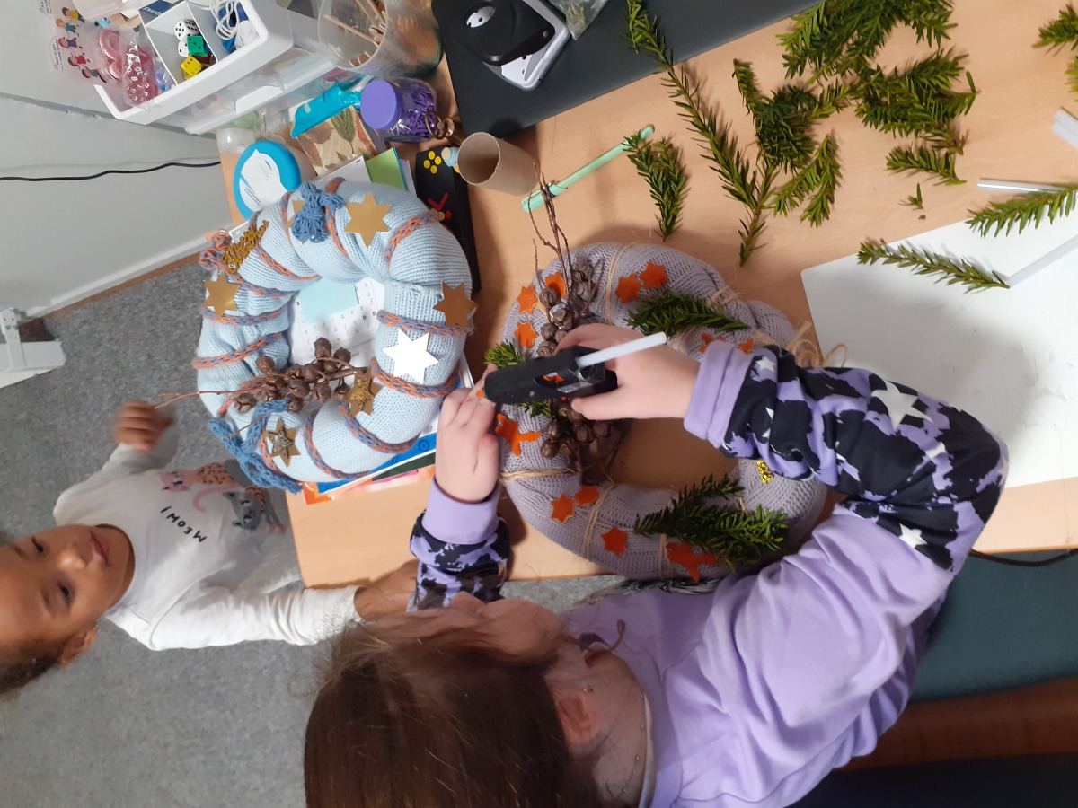 Tvoříme na adventní jarmark, užíváme si prvního sněhu, zpíváme koledy, hrajeme si, oslavujeme Mikuláše, tvoříme si vánoční dekorace domů, pečeme cukroví a pak konečně rozbalujeme dárky, jíme vlastní upečené cukroví, zpíváme koledy….