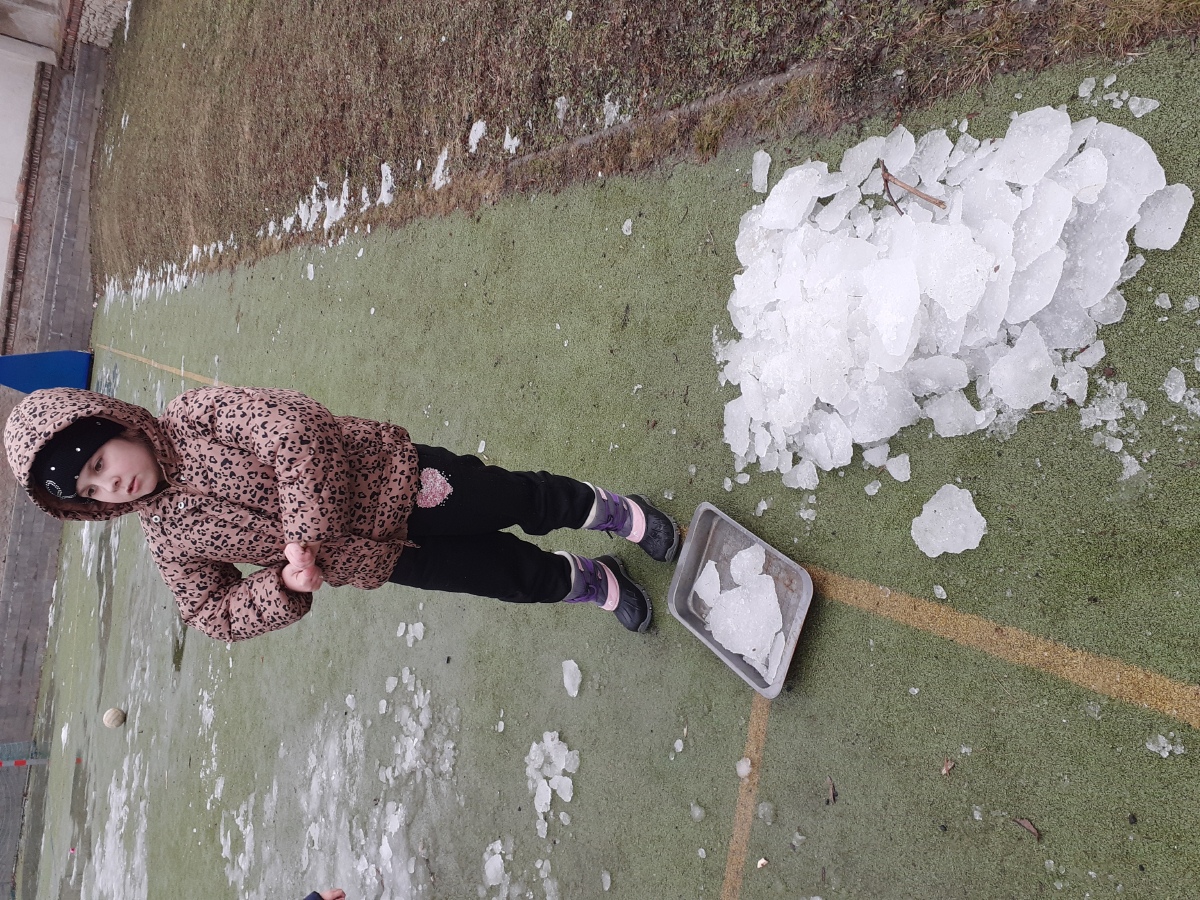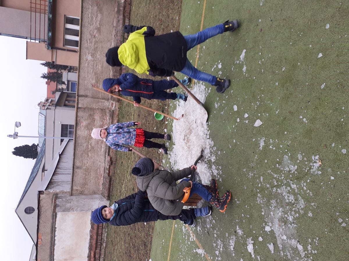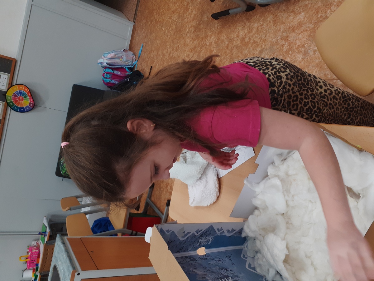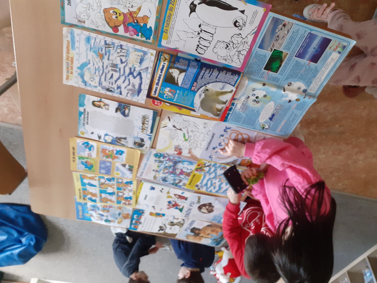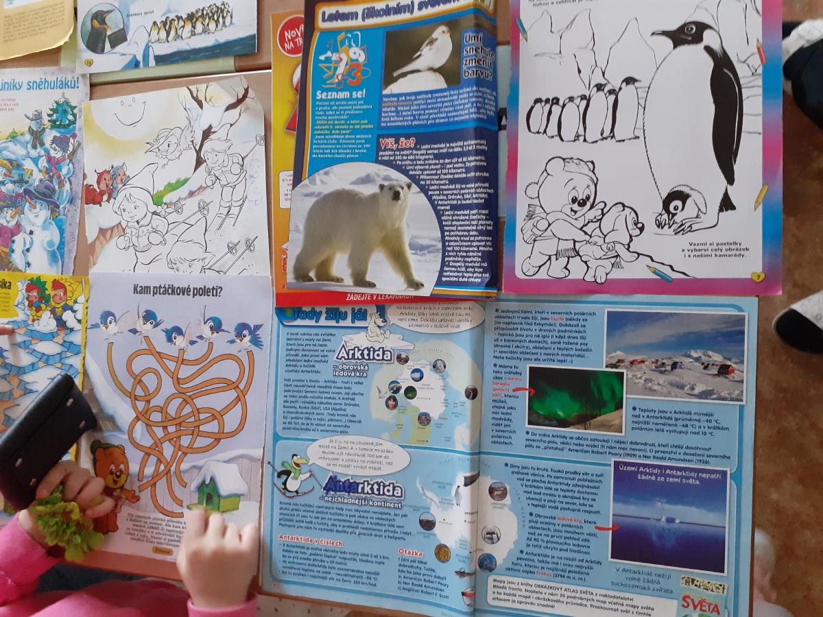 Zimní období ledna a února jsme si povídali o Antarktidě a Arktidě- co zde žije, roste, kdo tu žije (výzkumníci, eskymáci…), jaká je zde příroda, teploty v zimě a v létě, zajímavosti, jak vznikají, tají a pohybují se ledovce, jak vzniká polární záře, co je v polární stanici, jak vzniká sníh a led, proč sněží, zabývali jsme se stavbou sněhových vloček, které jsme i chytali na dlaň a pozorovali, protože toto téma jsme si užili letos plnými doušky i na vlastní kůži- letošní zima nám nabídla dostatek sněhu i ledu, stavěli jsme sněhuláky, mini iglú, sněhové domečky, dělali jsme pokusy se sněhem a ledem- vyráběli jsme ledové diamanty- čiré i barevné, vyrobili jsme improvizovanou ledovou kru a barvili jsme led a sníh, stopovali jsme ve sněhu, vyrobili jsme si díky mrazu přes noc zamrzlou polární krajinu, hráli jsme si na sněhu a ledu, vyráběli a kreslili/malovali jsme sněhové vločky a zimní obrázky, stříhali jsme papírové sněhové vločky, vyráběli tučňáky, plnili jsme různé úkoly k tématu- labyrinty, dokreslovačky, rébusy, počítali jsme polární zvířata, tučňáky aj., hádali jsme stopy zvěře ve sněhu, četli jsme si příběhy i o polárních tažních psech, pouštěli jsme si dokumentární filmy k tématu, zpívali jsme Grónskou písničku od J. Nohavici i Antarktidu od Pokáče, společně jsme vyrobili 3D polární krajinu- dívky chodící na šití přišili lednímu medvědovi uši, vyrobili/ušili jsme eskymáky, iglú…, hráli jsme hru tučňák Pingo, pracovali jsme s chytrou tužkou… ….
