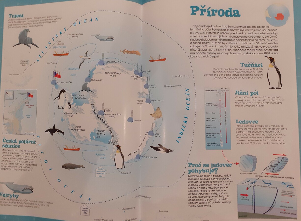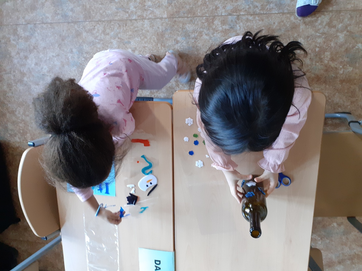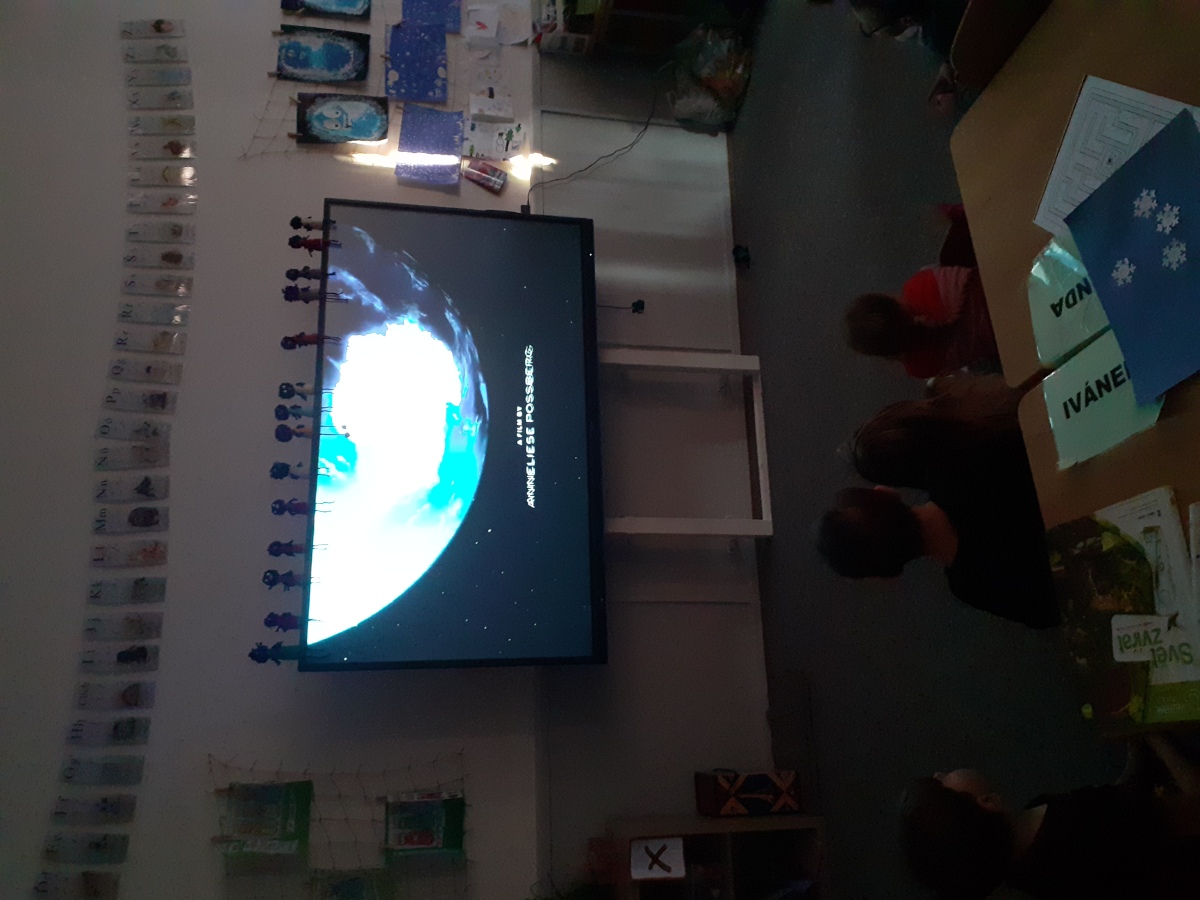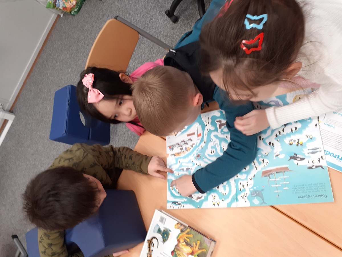 Zimní období ledna a února jsme si povídali o Antarktidě a Arktidě- co zde žije, roste, kdo tu žije (výzkumníci, eskymáci…), jaká je zde příroda, teploty v zimě a v létě, zajímavosti, jak vznikají, tají a pohybují se ledovce, jak vzniká polární záře, co je v polární stanici, jak vzniká sníh a led, proč sněží, zabývali jsme se stavbou sněhových vloček, které jsme i chytali na dlaň a pozorovali, protože toto téma jsme si užili letos plnými doušky i na vlastní kůži- letošní zima nám nabídla dostatek sněhu i ledu, stavěli jsme sněhuláky, mini iglú, sněhové domečky, dělali jsme pokusy se sněhem a ledem- vyráběli jsme ledové diamanty- čiré i barevné, vyrobili jsme improvizovanou ledovou kru a barvili jsme led a sníh, stopovali jsme ve sněhu, vyrobili jsme si díky mrazu přes noc zamrzlou polární krajinu, hráli jsme si na sněhu a ledu, vyráběli a kreslili/malovali jsme sněhové vločky a zimní obrázky, stříhali jsme papírové sněhové vločky, vyráběli tučňáky, plnili jsme různé úkoly k tématu- labyrinty, dokreslovačky, rébusy, počítali jsme polární zvířata, tučňáky aj., hádali jsme stopy zvěře ve sněhu, četli jsme si příběhy i o polárních tažních psech, pouštěli jsme si dokumentární filmy k tématu, zpívali jsme Grónskou písničku od J. Nohavici i Antarktidu od Pokáče, společně jsme vyrobili 3D polární krajinu- dívky chodící na šití přišili lednímu medvědovi uši, vyrobili/ušili jsme eskymáky, iglú…, hráli jsme hru tučňák Pingo, pracovali jsme s chytrou tužkou… ….
