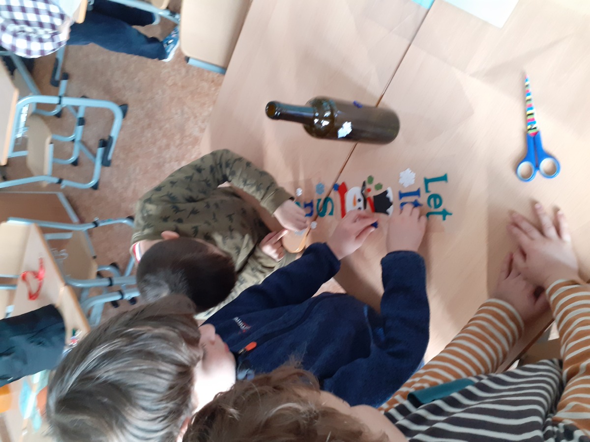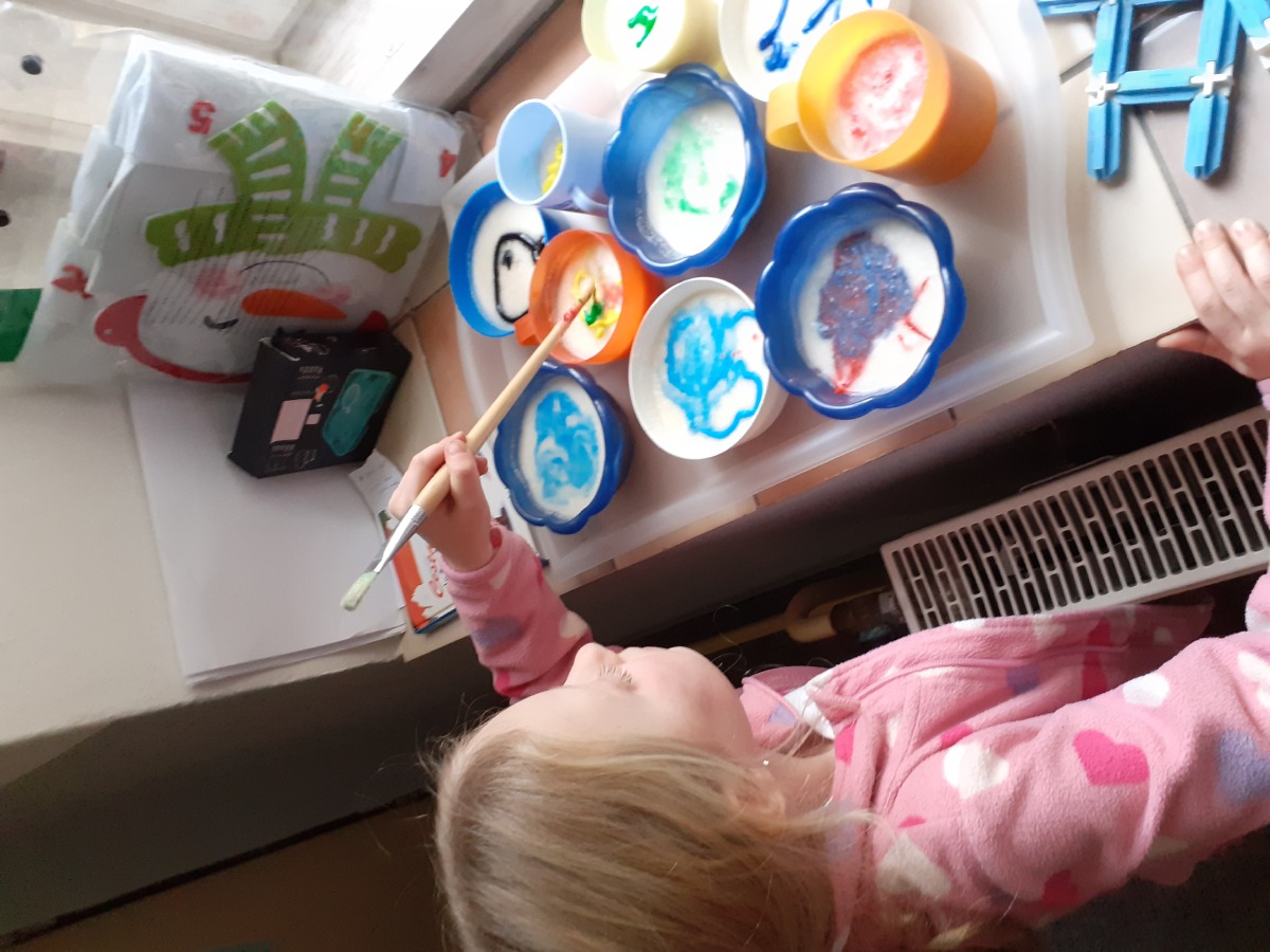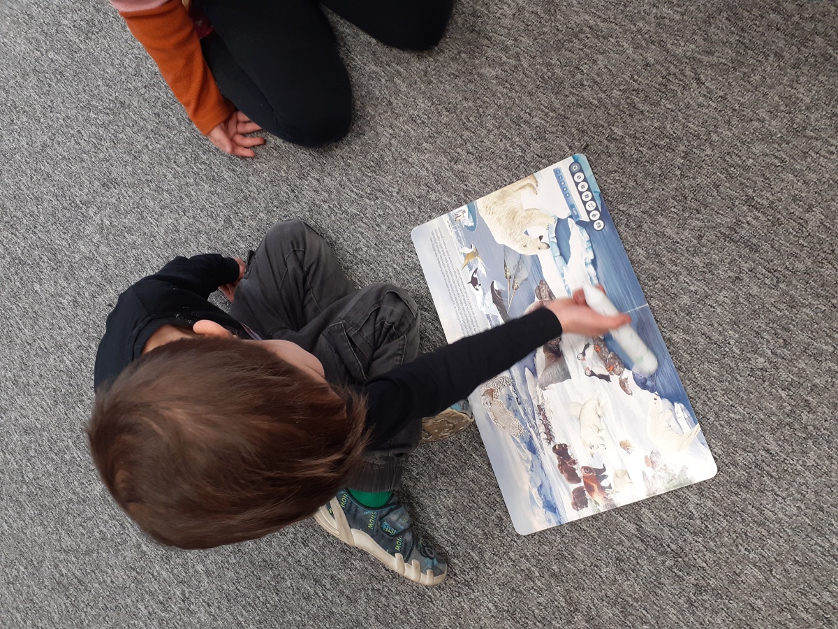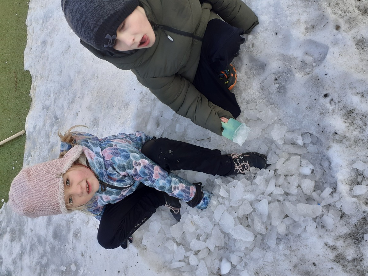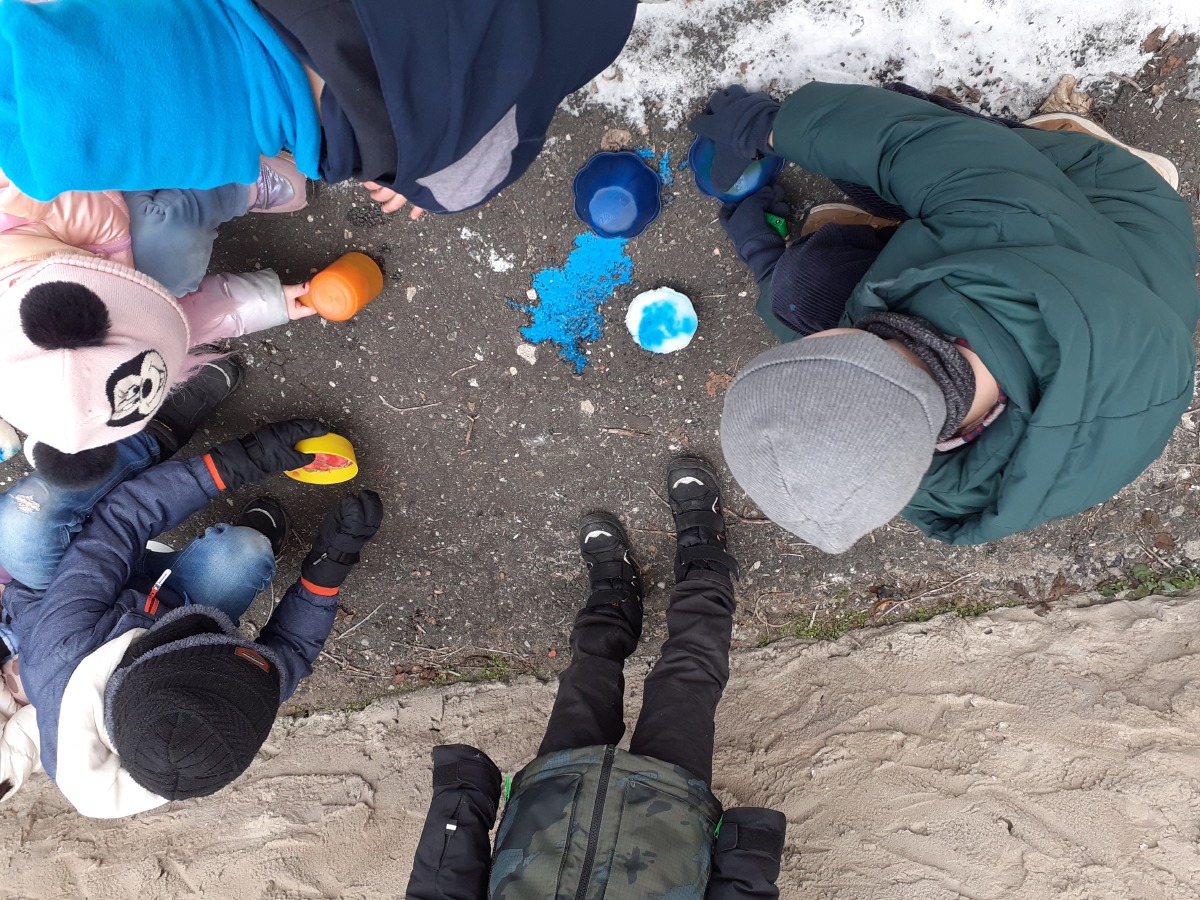Zimní období ledna a února jsme si povídali o Antarktidě a Arktidě- co zde žije, roste, kdo tu žije (výzkumníci, eskymáci…), jaká je zde příroda, teploty v zimě a v létě, zajímavosti, jak vznikají, tají a pohybují se ledovce, jak vzniká polární záře, co je v polární stanici, jak vzniká sníh a led, proč sněží, zabývali jsme se stavbou sněhových vloček, které jsme i chytali na dlaň a pozorovali, protože toto téma jsme si užili letos plnými doušky i na vlastní kůži- letošní zima nám nabídla dostatek sněhu i ledu, stavěli jsme sněhuláky, mini iglú, sněhové domečky, dělali jsme pokusy se sněhem a ledem- vyráběli jsme ledové diamanty- čiré i barevné, vyrobili jsme improvizovanou ledovou kru a barvili jsme led a sníh, stopovali jsme ve sněhu, vyrobili jsme si díky mrazu přes noc zamrzlou polární krajinu, hráli jsme si na sněhu a ledu, vyráběli a kreslili/malovali jsme sněhové vločky a zimní obrázky, stříhali jsme papírové sněhové vločky, vyráběli tučňáky, plnili jsme různé úkoly k tématu- labyrinty, dokreslovačky, rébusy, počítali jsme polární zvířata, tučňáky aj., hádali jsme stopy zvěře ve sněhu, četli jsme si příběhy i o polárních tažních psech, pouštěli jsme si dokumentární filmy k tématu, zpívali jsme Grónskou písničku od J. Nohavici i Antarktidu od Pokáče, společně jsme vyrobili 3D polární krajinu- dívky chodící na šití přišili lednímu medvědovi uši, vyrobili/ušili jsme eskymáky, iglú…, hráli jsme hru tučňák Pingo, pracovali jsme s chytrou tužkou… ….
