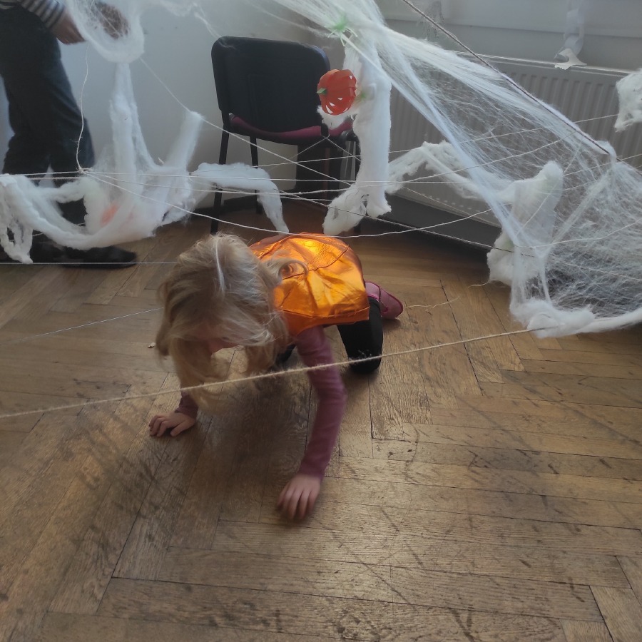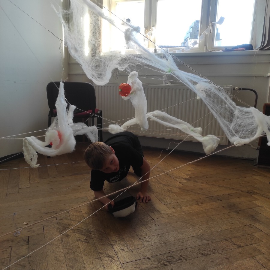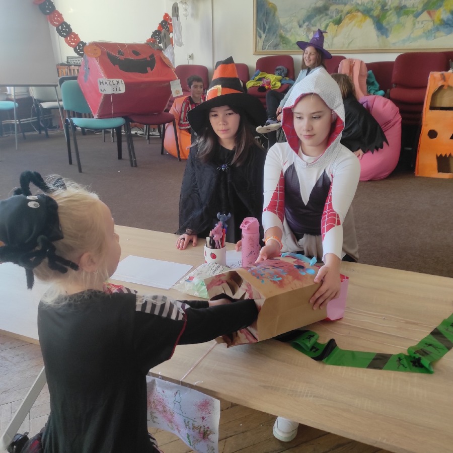 Také jsem navštívili aulu, která se proměnila ve strašidelný svět. Žákovská školní rada si pro nás připravila stanoviště s různými úkoly. Děti se s nadšením zapojily, smály se, trochu se bály, ale hlavně si celý den společně užily.