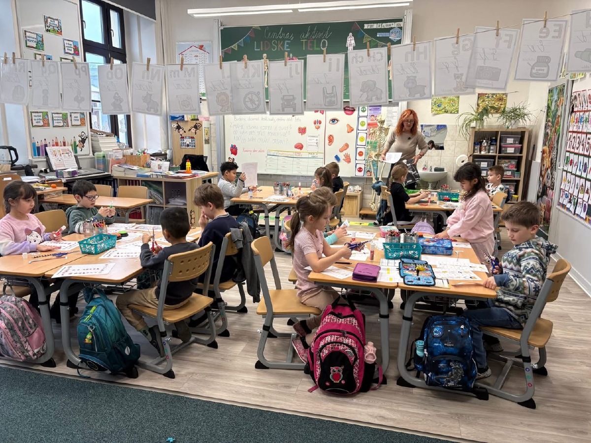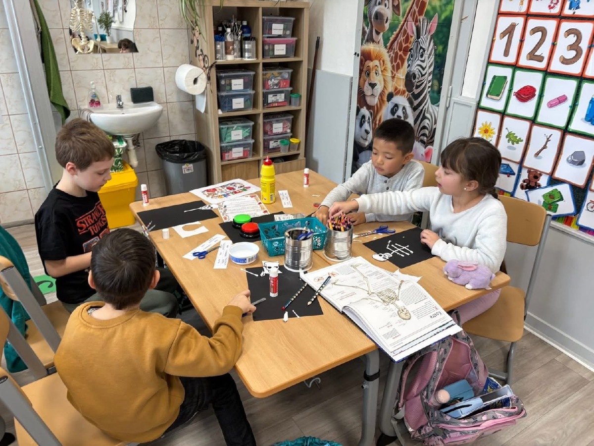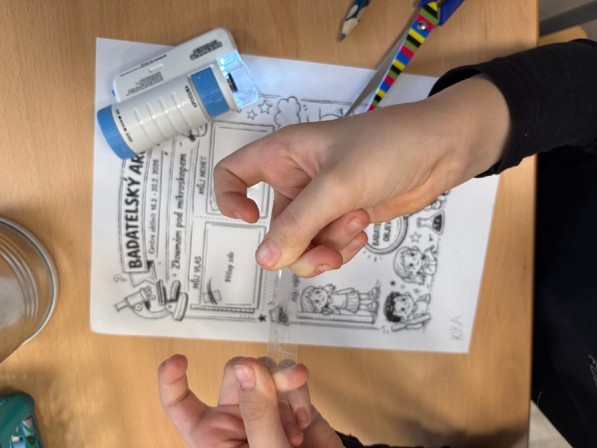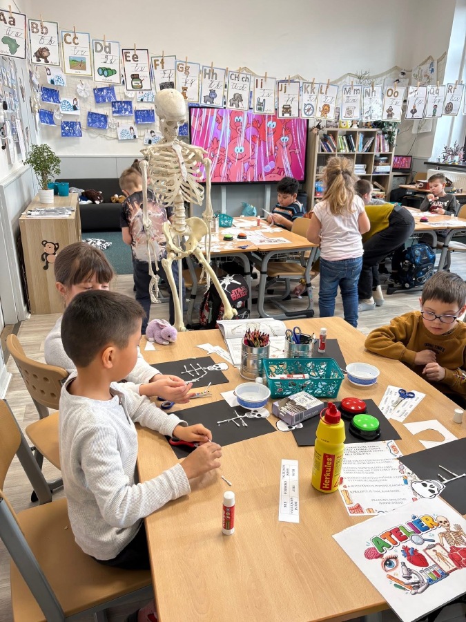 Zkoumali jsme své vlasy a nehty pod mikroskopem, pozorovali jejich strukturu a porovnávali, v čem se liší. Děti pracovaly jako opravdoví badatelé. Přiřazovali jsme obrázky a názvy částí těla, četli jednoduché popisy a učili se nová slova. V ateliéru jsme lepili kostlivce z vatových tyčinek a povídali si o tom, k čemu nám slouží kostra. Velkým zážitkem byla i kostra přímo ve třídě, kterou jsme si mohli zblízka prohlédnout. V matematice jsme počítali, kolik máme orgánů ve dvojici (oči, uši, plíce…) a porovnávali, co je v těle jen jednou a co dvakrát. Děti pracovaly samostatně, spolupracovaly ve skupinách a s nadšením objevovaly, jak je lidské tělo dokonalé a promyšlené. Byl to týden plný zkoumání, tvoření i radosti z objevování.