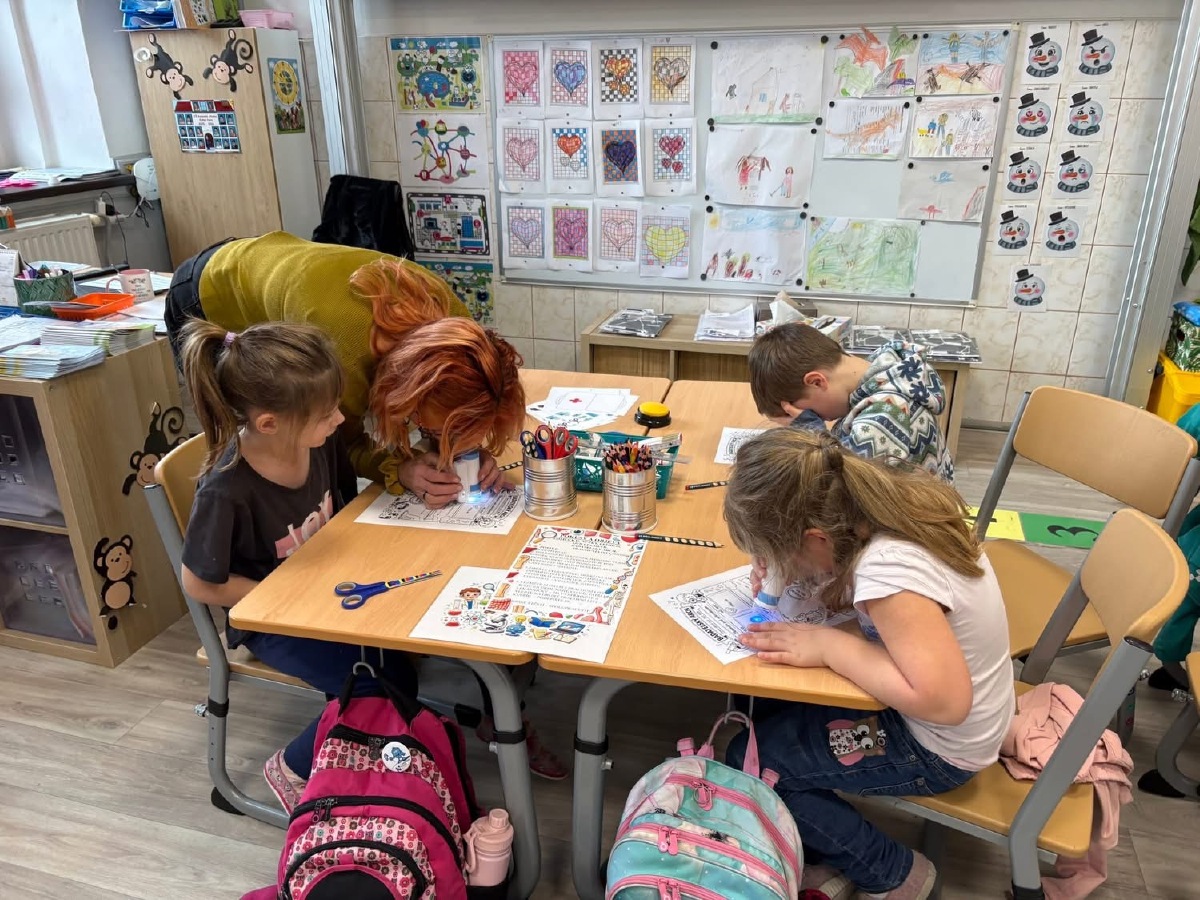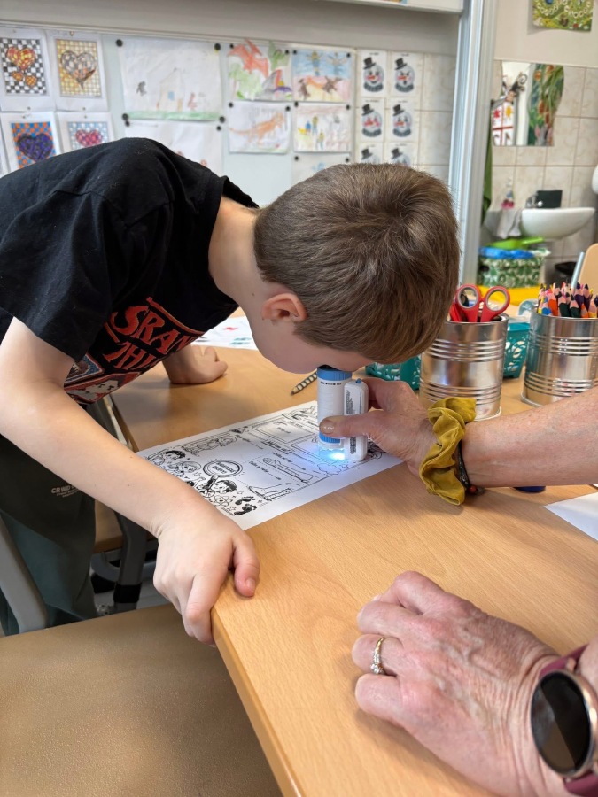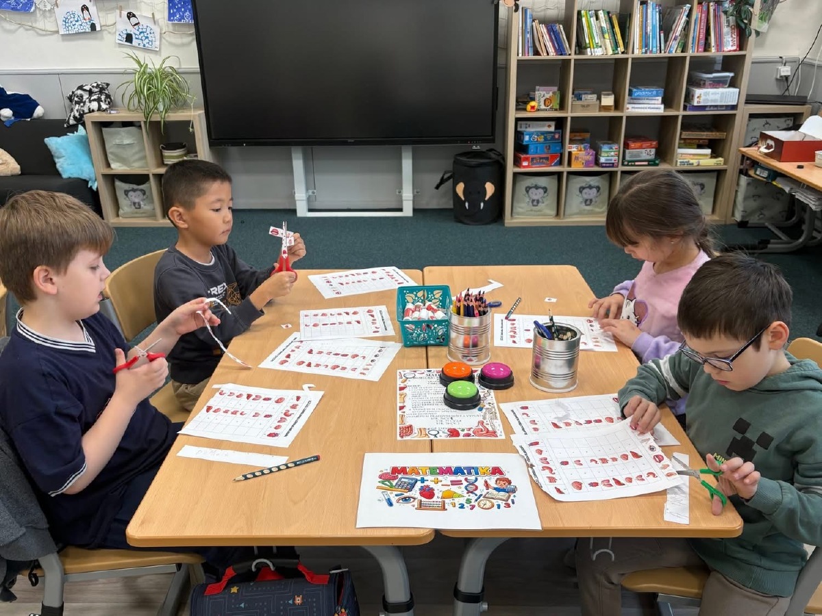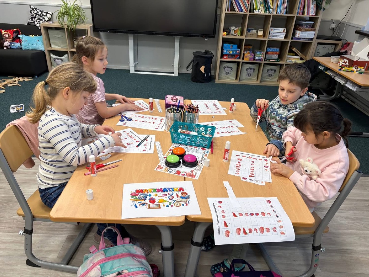 Zkoumali jsme své vlasy a nehty pod mikroskopem, pozorovali jejich strukturu a porovnávali, v čem se liší. Děti pracovaly jako opravdoví badatelé. Přiřazovali jsme obrázky a názvy částí těla, četli jednoduché popisy a učili se nová slova. V ateliéru jsme lepili kostlivce z vatových tyčinek a povídali si o tom, k čemu nám slouží kostra. Velkým zážitkem byla i kostra přímo ve třídě, kterou jsme si mohli zblízka prohlédnout. V matematice jsme počítali, kolik máme orgánů ve dvojici (oči, uši, plíce…) a porovnávali, co je v těle jen jednou a co dvakrát. Děti pracovaly samostatně, spolupracovaly ve skupinách a s nadšením objevovaly, jak je lidské tělo dokonalé a promyšlené. Byl to týden plný zkoumání, tvoření i radosti z objevování.