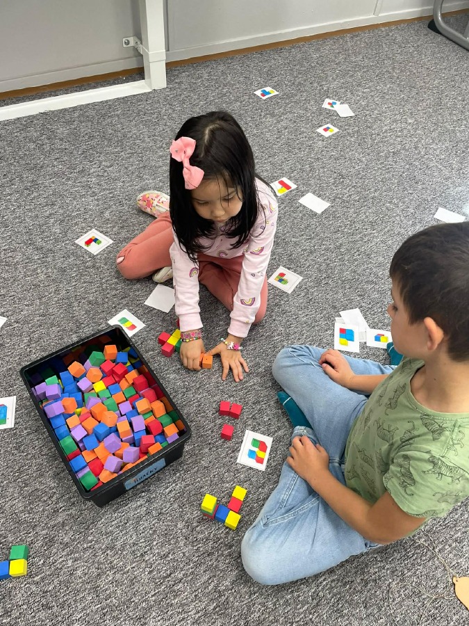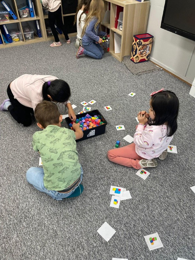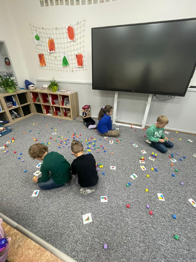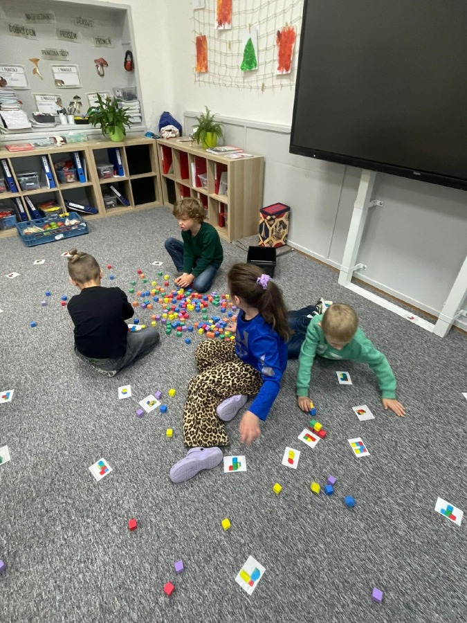 Máme za sebou první týdenní centra aktivit na písmeno E. V centru Lovci písmenek jsme hledali písmeno E a e a vkládali ho do slov + jsme trénovali slabiky. V centru Ateliér jsme tvořili písmeno, které už umíme, a rozvíjeli svou kreativitu. V centru Stavitelé jsme stavěli z krychliček podle předlohy a zkoušeli prostorovou představivost. A v centru Kimova hra jsme si hráli s čísly a trénovali paměť.