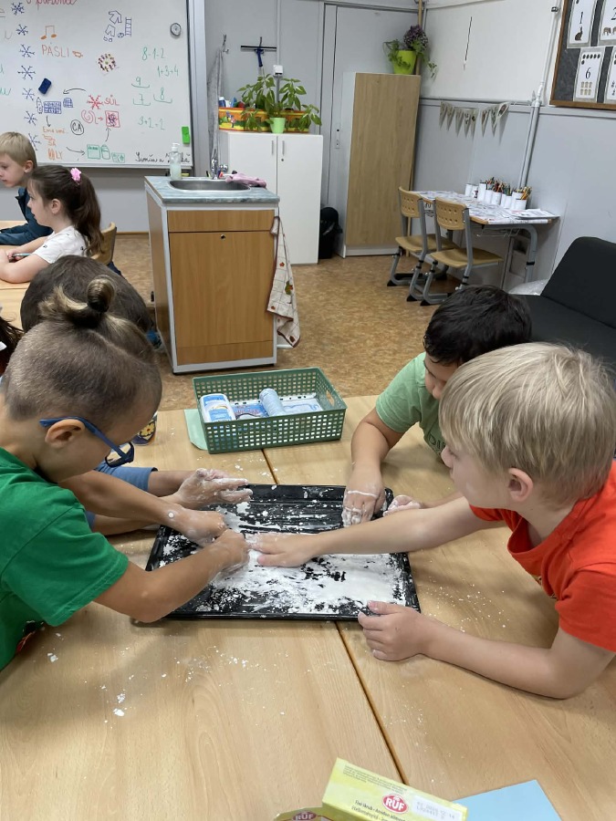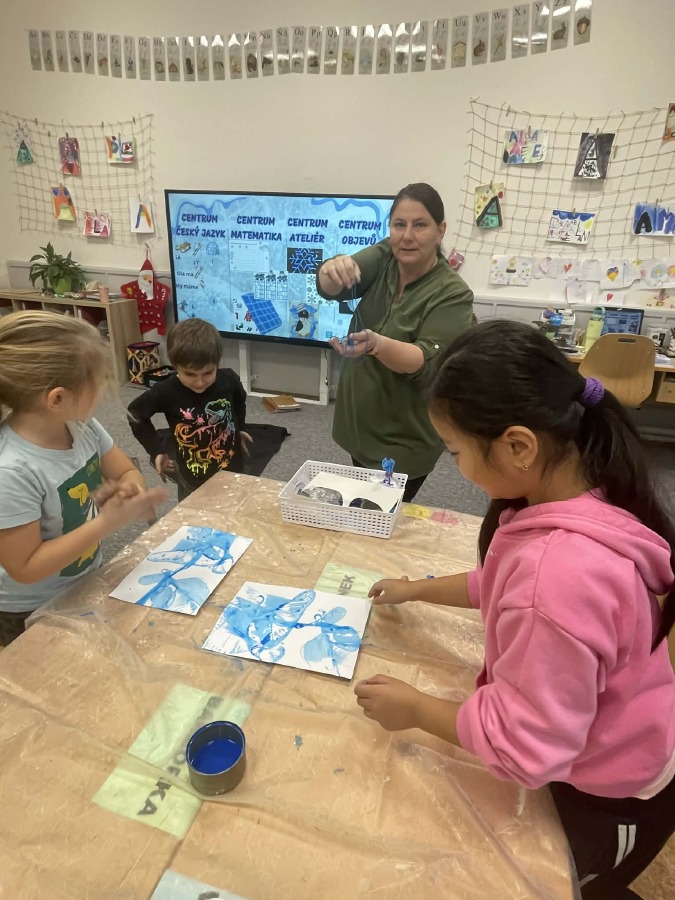 První týden v prosinci jsme měli další centra aktivit na téma Zima. V českém jazyce jsme skládali ze slov věty a trénovali čtení, přiřazovali jsme zimní věci k počátečním písmenům. V matematice jsme museli spočítat cestu eskymáka k iglu, zahráli kimovu hru se zimním oblečením a trénovali počty na Ipadech. V ateliéru jsem kouzlili se solí a provázkem. A v objevech každé centrum tvořilo sníh z jiných surovin ( kuk. škrob, jedlá soda, pěna na holení, voda, krém). Tato centra byla plná nových věcí a zkušeností. Moc jsme si centra užili, to můžete vidět na fotkách. ![]()
