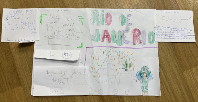 Čekala je Amerika - úkolem bylo vytvořit poutavý plakát cestovní kanceláře. Cestovní kancelář nás měla nalákat na zajímavý zájezd do jednoho velkého města v Americe dle vlastního výběru. Tento týden nás čeká prezentace a vypadá to opravdu zajímavě. Děti se v prezentacích před třídou lepší a lepší.