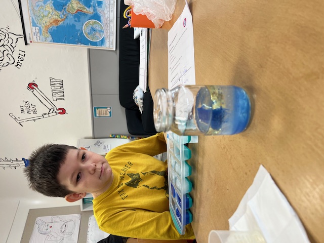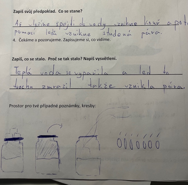 Děti bádaly v oblasti koloběhu vody - zkoušely si pokus, jak vytvořit "mrak,mlhu". Dále zjišťovaly teploty na Antarktidě. Zkusily si pokus na hustotu tekutin.