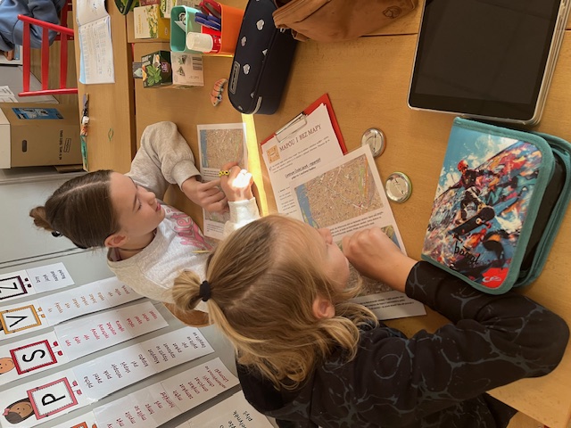 Český jazyk měl dvě centra. V jednom centru je mapa zavedla až na Pražský hrad. Děti měly za úkol si zjistit základní informace o našem prezidentovi, zapsat do myšlenkové mapy. Představit si, že pan prezident přijede k nám do školy a předvést s ním rozhovor. Také velice náročný úkol, s kterým se velice statečně děti popraly