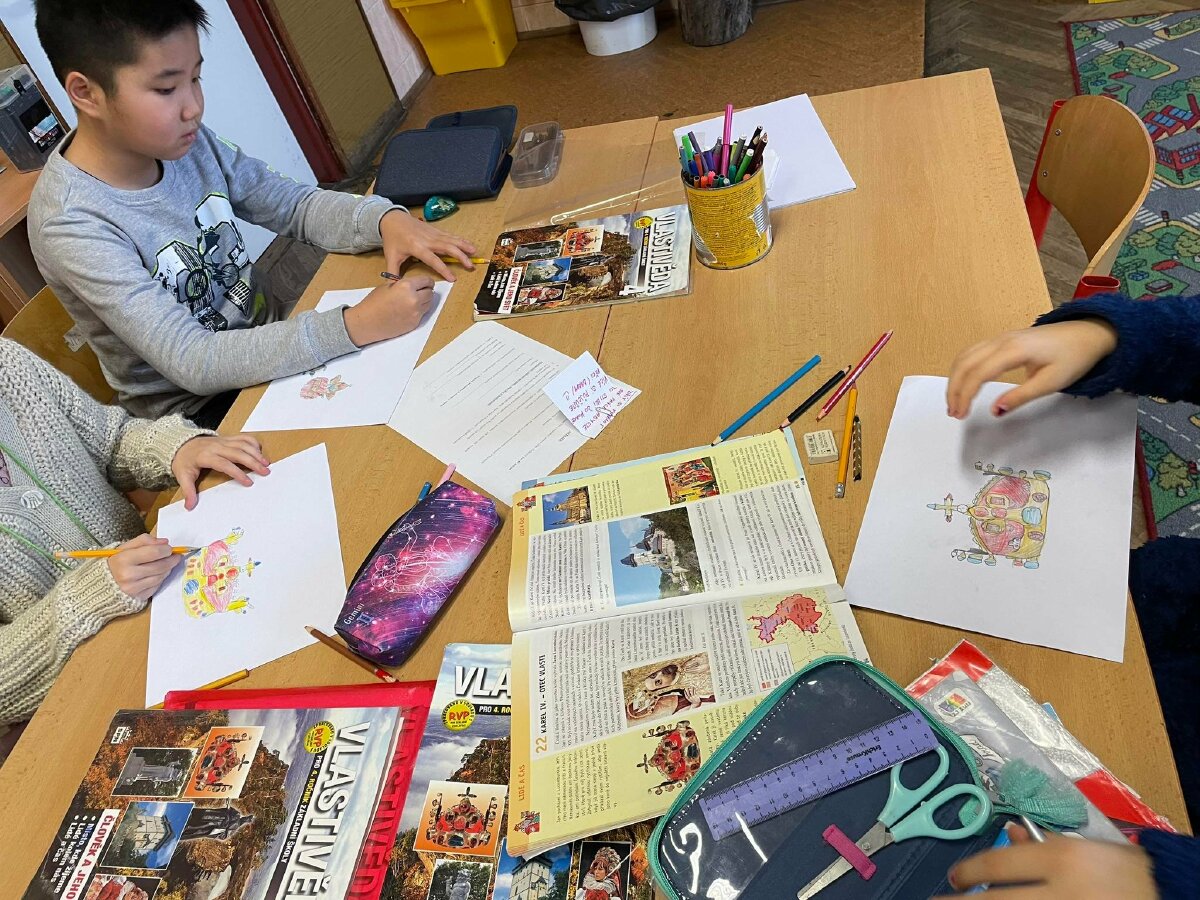 Tentokrát si zahráli na návrháře a pro samotného Karla IV. navrhovali svatováclavskou korunu. V textu se snažili najít nějaké vetřelce, co tam nepatří a k tomu to byl příběh Macha a Šebestové. V centru psaní si dělali učební pomůcku Lapbook Karel IV.. Bylo vidět, že čtvrťáci by ve třídě nepotřebovali ani paní učitelku, všechno zvládli sami a práce se jim moc povedly. Posuďte sami. ![]()