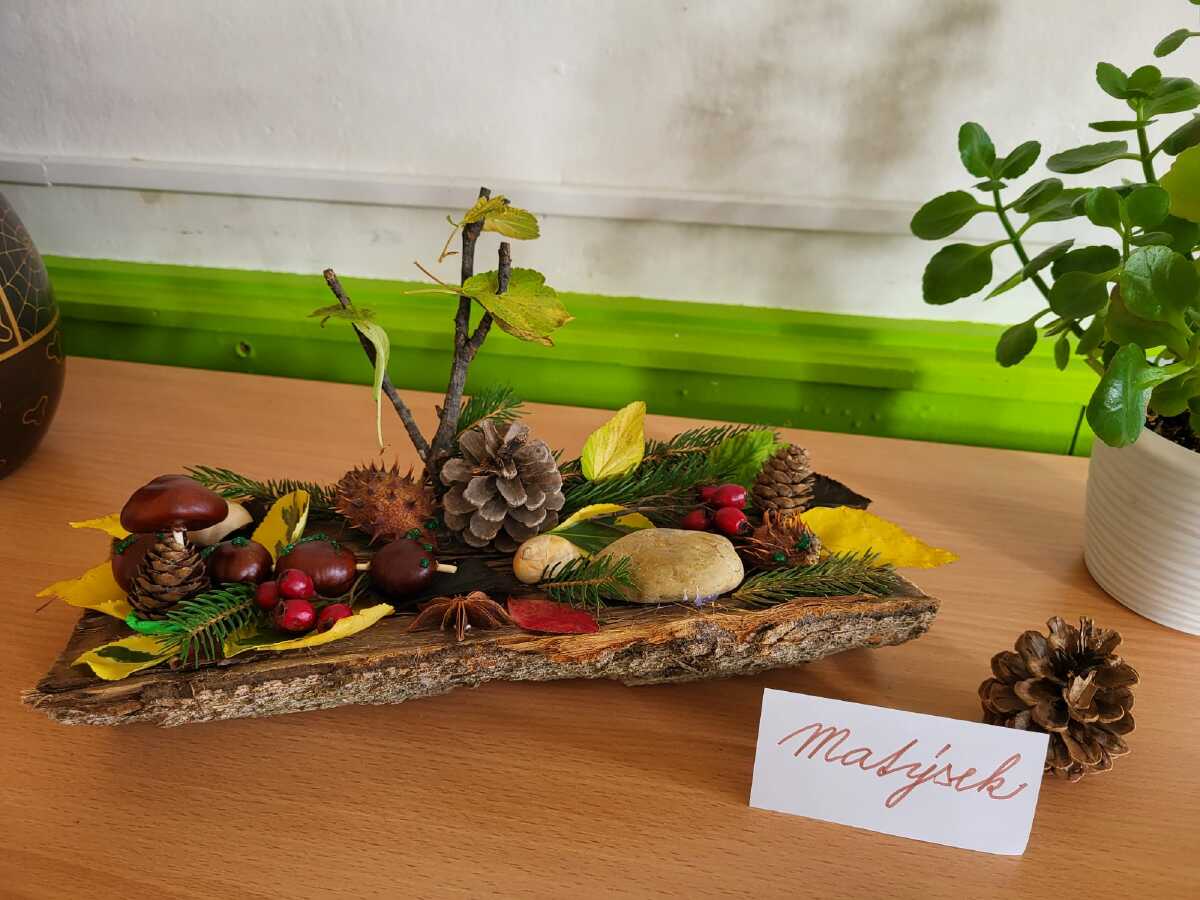 Nejprve z přinesených přírodnin podzimu vytvořily lesní království z malých zvířecích figurek. Přispěly tak svými dílky k lepší výzdobě třídy. Šikovnost děti prokázaly při tvorbě krabiček z dřevěných špachtlí jako zajímavou úschovnu pro takzvaný semafor... ten používají pro barevné vyjádření svých pocitů, nálad, úspěchů v průběhu výuky. Na lavicích budou pěknou barevnou ozdobou.