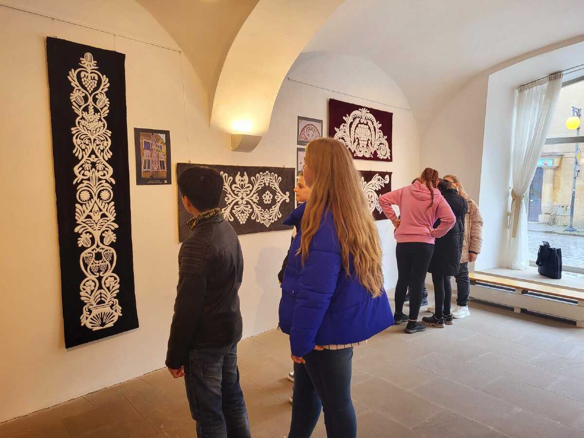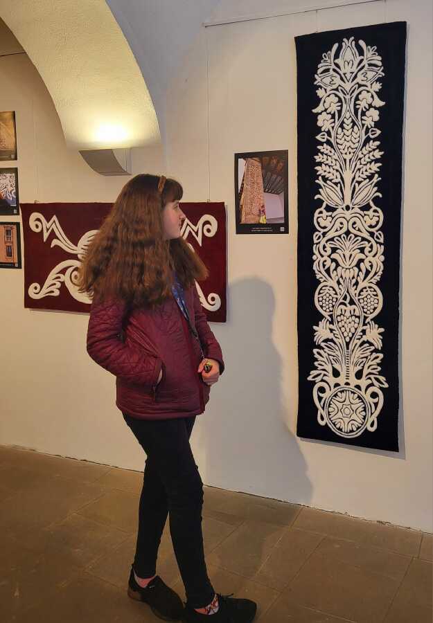 6.A se v hodinách výtvarné výchovy vydala do Spolkového domu prohlédnout si krasné tradiční ornamenty ze zničených domů v Nové Kachovce u Chersonu.