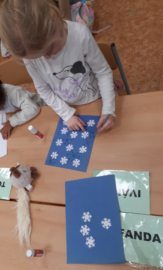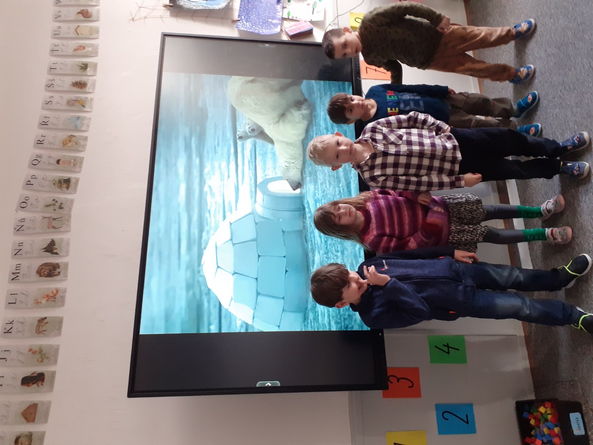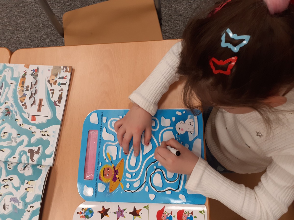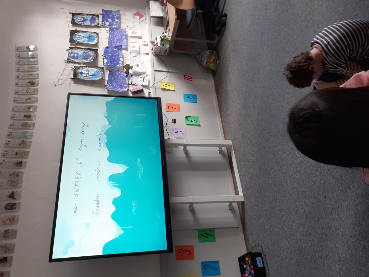 Zimní období ledna a února jsme si povídali o Antarktidě a Arktidě- co zde žije, roste, kdo tu žije (výzkumníci, eskymáci…), jaká je zde příroda, teploty v zimě a v létě, zajímavosti, jak vznikají, tají a pohybují se ledovce, jak vzniká polární záře, co je v polární stanici, jak vzniká sníh a led, proč sněží, zabývali jsme se stavbou sněhových vloček, které jsme i chytali na dlaň a pozorovali, protože toto téma jsme si užili letos plnými doušky i na vlastní kůži- letošní zima nám nabídla dostatek sněhu i ledu, stavěli jsme sněhuláky, mini iglú, sněhové domečky, dělali jsme pokusy se sněhem a ledem- vyráběli jsme ledové diamanty- čiré i barevné, vyrobili jsme improvizovanou ledovou kru a barvili jsme led a sníh, stopovali jsme ve sněhu, vyrobili jsme si díky mrazu přes noc zamrzlou polární krajinu, hráli jsme si na sněhu a ledu, vyráběli a kreslili/malovali jsme sněhové vločky a zimní obrázky, stříhali jsme papírové sněhové vločky, vyráběli tučňáky, plnili jsme různé úkoly k tématu- labyrinty, dokreslovačky, rébusy, počítali jsme polární zvířata, tučňáky aj., hádali jsme stopy zvěře ve sněhu, četli jsme si příběhy i o polárních tažních psech, pouštěli jsme si dokumentární filmy k tématu, zpívali jsme Grónskou písničku od J. Nohavici i Antarktidu od Pokáče, společně jsme vyrobili 3D polární krajinu- dívky chodící na šití přišili lednímu medvědovi uši, vyrobili/ušili jsme eskymáky, iglú…, hráli jsme hru tučňák Pingo, pracovali jsme s chytrou tužkou… ….