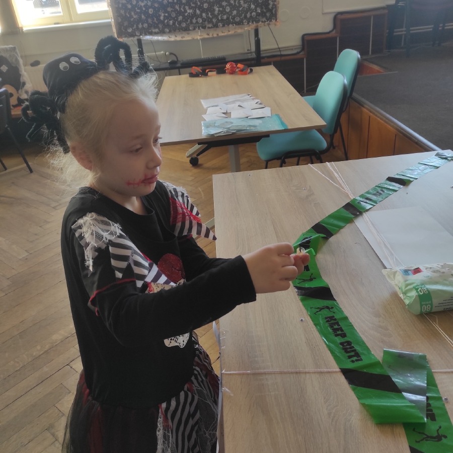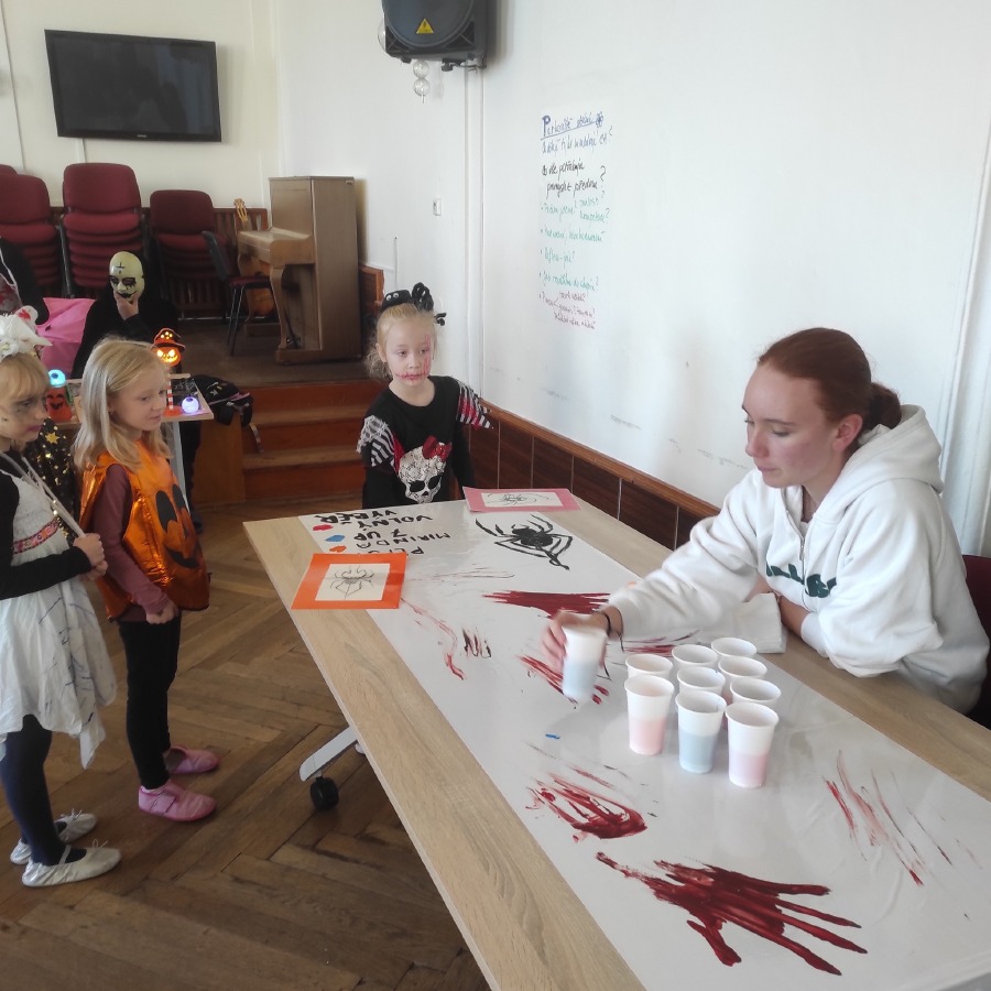 Také jsem navštívili aulu, která se proměnila ve strašidelný svět. Žákovská školní rada si pro nás připravila stanoviště s různými úkoly. Děti se s nadšením zapojily, smály se, trochu se bály, ale hlavně si celý den společně užily.