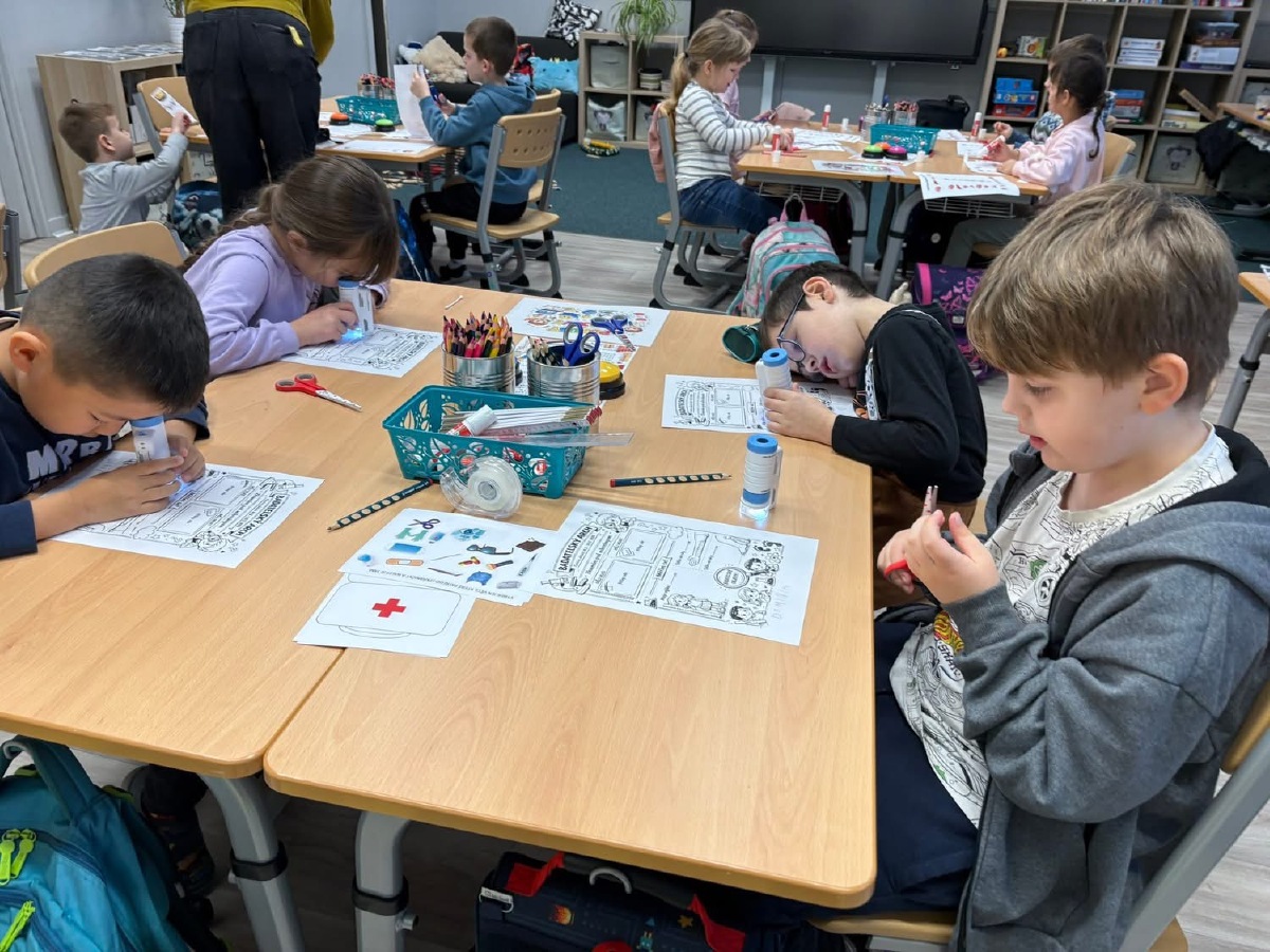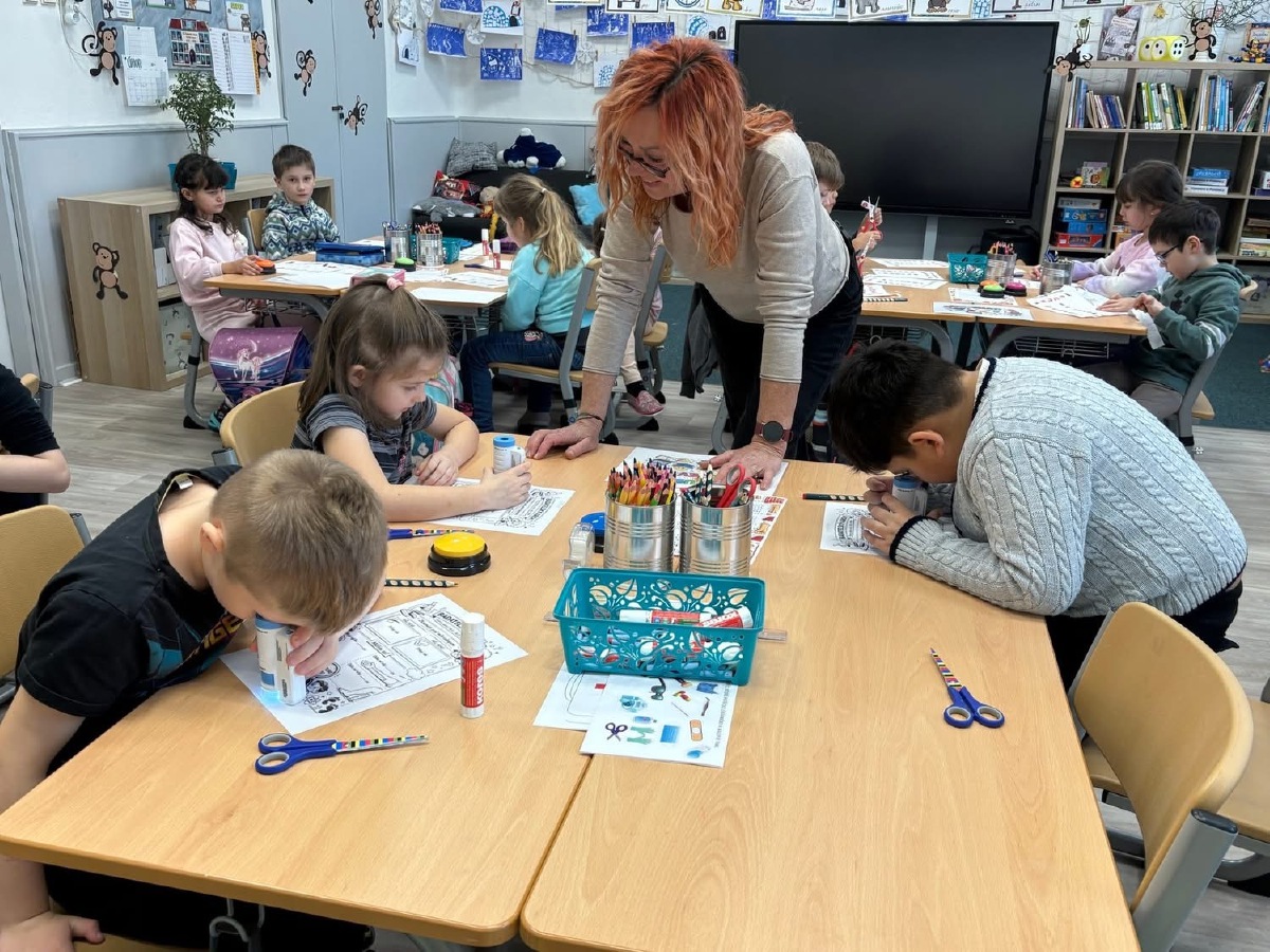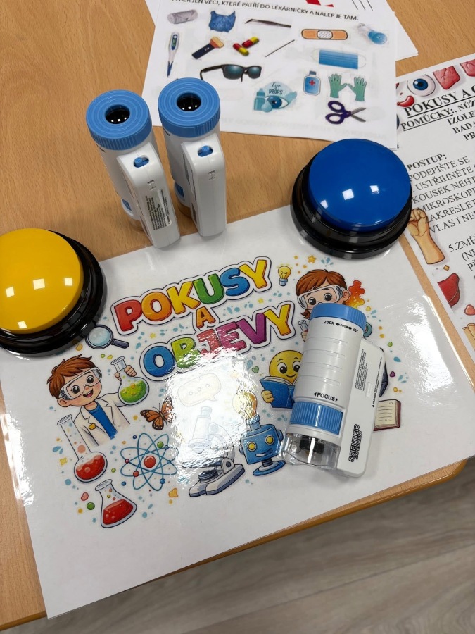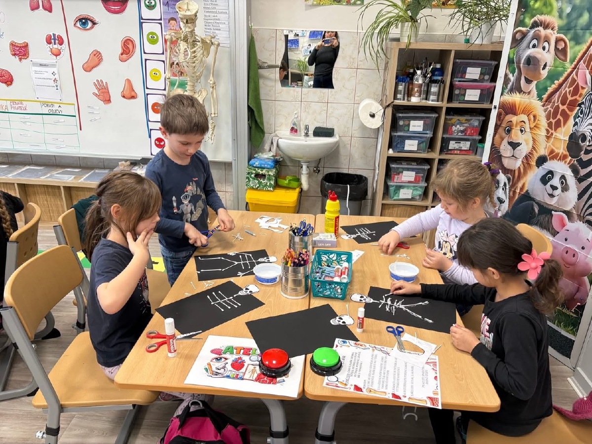 Zkoumali jsme své vlasy a nehty pod mikroskopem, pozorovali jejich strukturu a porovnávali, v čem se liší. Děti pracovaly jako opravdoví badatelé. Přiřazovali jsme obrázky a názvy částí těla, četli jednoduché popisy a učili se nová slova. V ateliéru jsme lepili kostlivce z vatových tyčinek a povídali si o tom, k čemu nám slouží kostra. Velkým zážitkem byla i kostra přímo ve třídě, kterou jsme si mohli zblízka prohlédnout. V matematice jsme počítali, kolik máme orgánů ve dvojici (oči, uši, plíce…) a porovnávali, co je v těle jen jednou a co dvakrát. Děti pracovaly samostatně, spolupracovaly ve skupinách a s nadšením objevovaly, jak je lidské tělo dokonalé a promyšlené. Byl to týden plný zkoumání, tvoření i radosti z objevování.