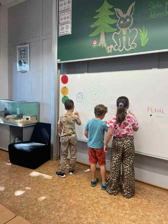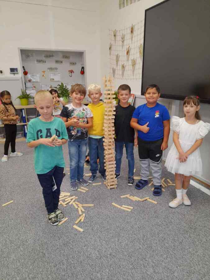 První školní měsíc jsme strávili poznáváním nového prostředí – nejen ve třídě, ale i v okolí školy. Vyzkoušeli jsme první práci ve dvojicích, pracovat s Ipady, objevili radost z tvoření a při přestávkách jsme zjistili, že dokážeme postavit komíny vyšší než my sami. Září bylo plné objevování, her a prvních společných zážitků.![]()