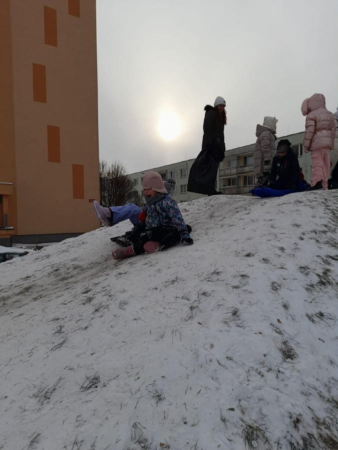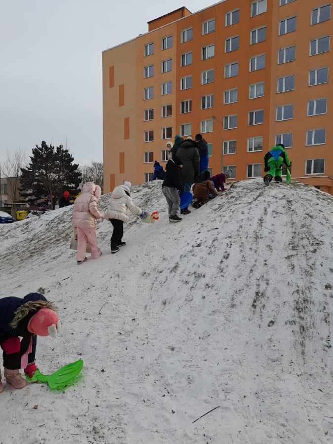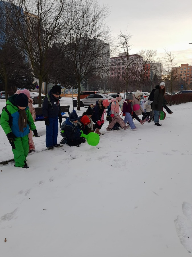 Napadl sníh a my si ho chtěli užít, ale musíme se přece učit. Dá se to spojit v jedno? Jasně, že dá! Měli jsme teplé oblečení, teplý čaj, něco na bobování a vyrazili jsme. Cestou jsme trénovali slabiky a písmenka. Hledali jsme věci, které začínají na daná písmenka/slabiky. Psali jsme do sněhu a počítali jsme příklady. Potom jsme mohli vyrazit na kopec. Sjela ho i paní učitelka. I při bobování jsme se vlastně učili - domlouváme se, nasloucháme instrukcím, učíme se ohleduplnosti a pomoci druhým, chováme se zodpovědně, přizpůsobujeme své chování k podmínkám. Nešťastnou náhodou se rozbil pekáč, který nám půjčila paní družinářka. Koupili jsme proto nový a dali jsme ji ho. ![]()