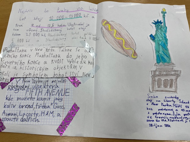 Čekala je Amerika - úkolem bylo vytvořit poutavý plakát cestovní kanceláře. Cestovní kancelář nás měla nalákat na zajímavý zájezd do jednoho velkého města v Americe dle vlastního výběru. Tento týden nás čeká prezentace a vypadá to opravdu zajímavě. Děti se v prezentacích před třídou lepší a lepší.