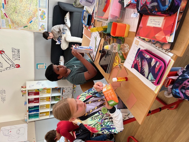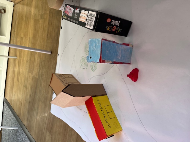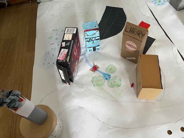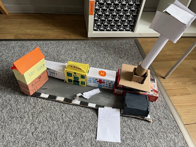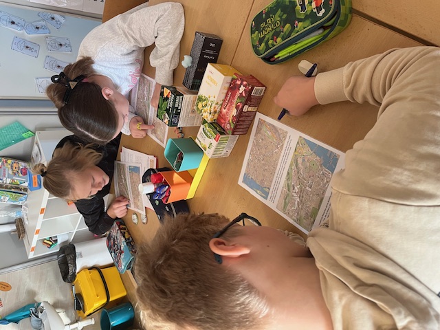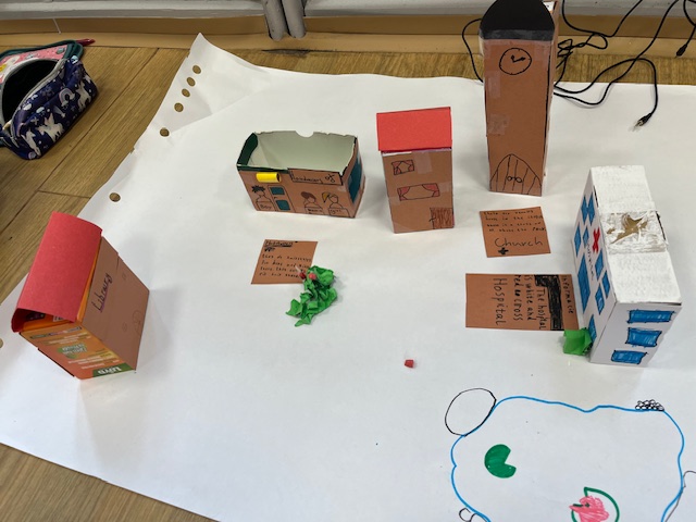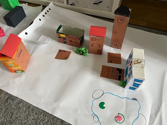 V angličtině spojené s pracovními činnostmi děti tvořily své vysněné město (budovy vyráběly z krabiček od čajů), vytvořily své město a anglicky dneska popisovaly své budovy, vedle čeho se nacházejí, jak vypadají, co ve městě vidíme.... Samy zjistily, že prezentace před ostatními v anglickém jazyce není vůbec jednoduchá a vyžaduje i respekt od ostatních.